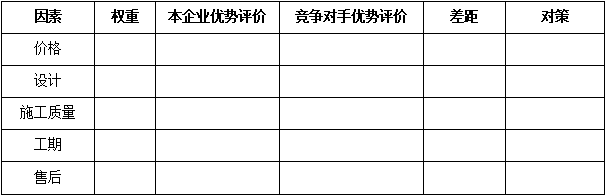 F、關(guān)鍵成交因素對比:對于某一個細(xì)分領(lǐng)域的客戶而言,成交的關(guān)鍵因素選項(xiàng)是相對清晰的,而這些因素對成交的影響權(quán)重是不同的,經(jīng)營分析就需要識別競爭對手在哪些關(guān)鍵成交因素上占據(jù)優(yōu)勢。例如:對于裝飾裝修工程行業(yè)的家庭客戶而言,其成交因素包括:價格、設(shè)計、施工質(zhì)量、工期、售后的維修維保服務(wù)等。對于一個收入中等的自住新房客戶而言,價格、設(shè)計因素、施工質(zhì)量是其主要成交因素,而對于商鋪、投資房產(chǎn)來說,工期的重要性不言而喻。如下表: